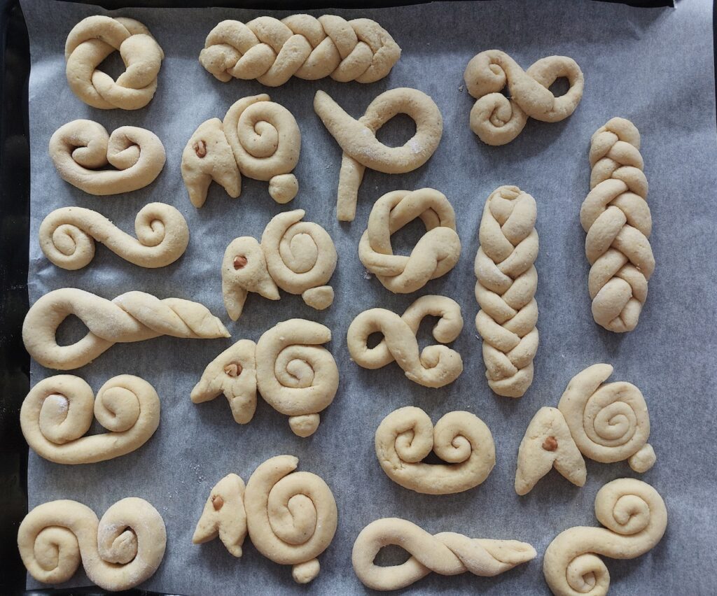 - Tvary klademe na plech s pečicím papírem a potřeme bílkem – necháme dalších 20 minut kynout a vkládáme do předehřáté trouby. Pečeme na 170°C / 20 minut (dokud jidáše nezezlátnou)